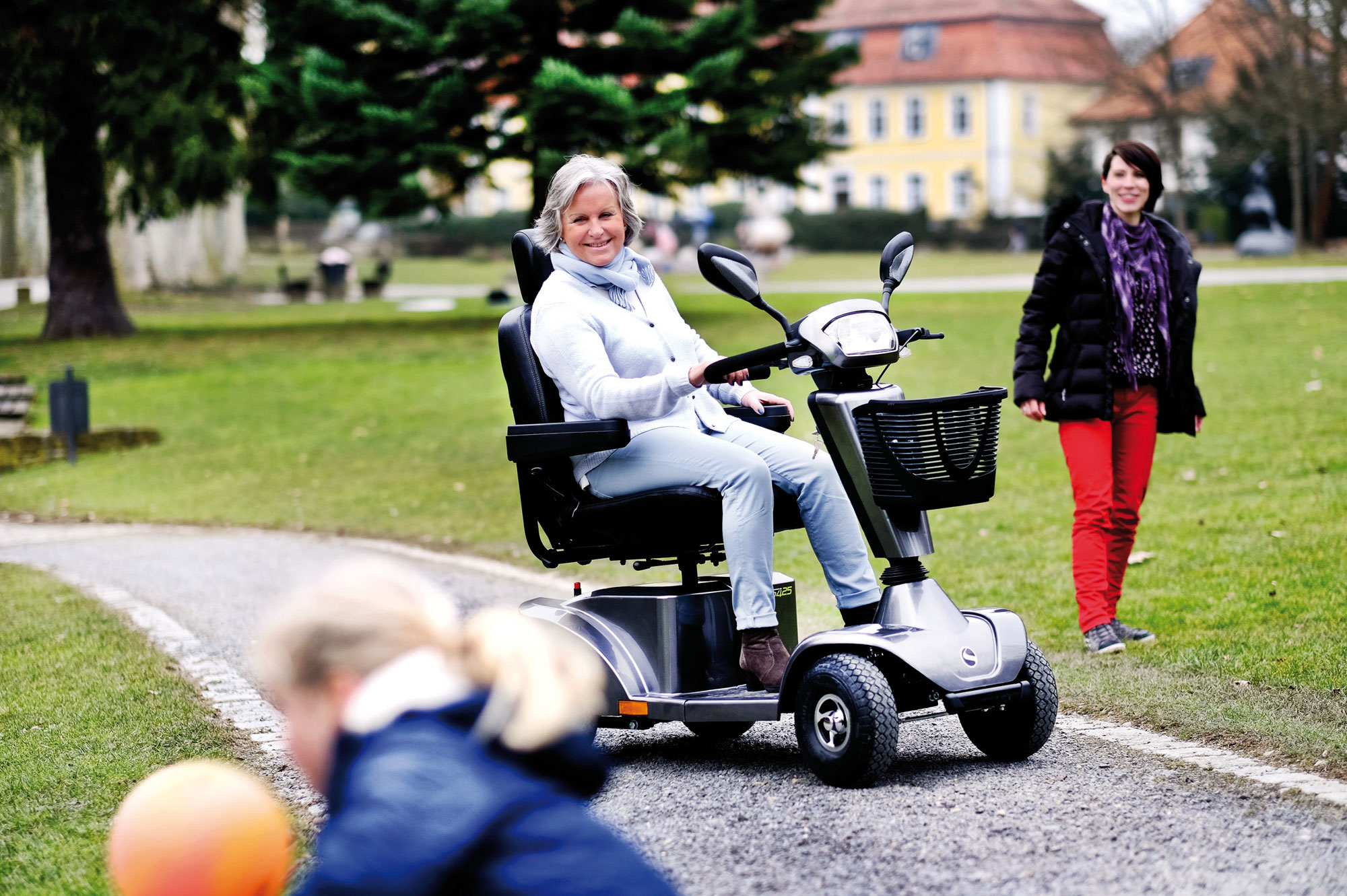 Dank der größeren Räder lassen sich Bordsteinkanten und übliche Hindernisse im Freien einfacher überwinden. Längere Fahrten können durch die größeren 55 Ah Batterien leichter bewältigt werden.