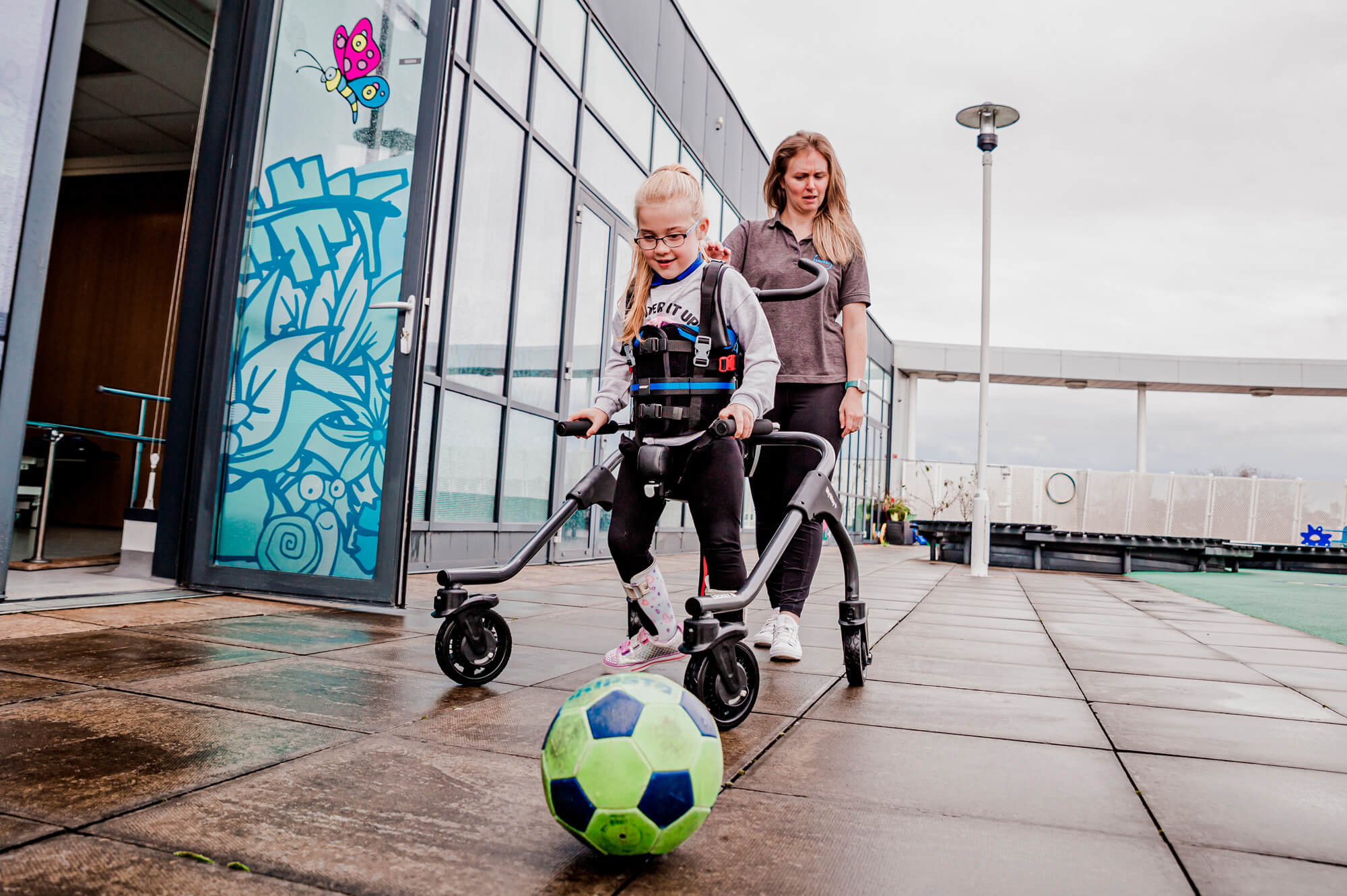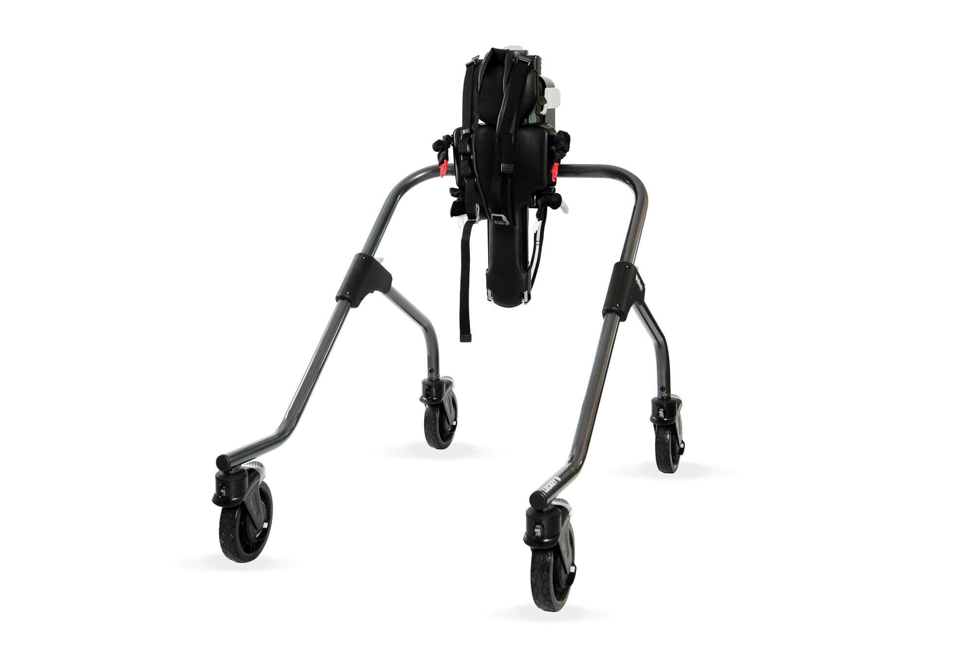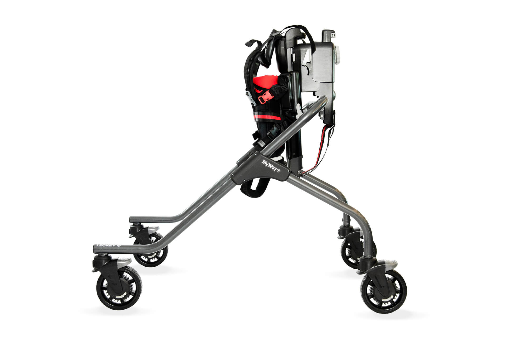 Kinder mit zusätzlichen Bedürfnissen haben oft eine schwächere Muskulatur, vor allem im Hüftbereich. Dies kann sich auf ihren Gang, ihre Funktion und die Entwicklung der Hüftgelenke auswirken. Die neue Side-Step-Funktion des MyWay+ arretiert die Rollen in einer seitlichen Position und bietet so die Möglichkeit, die Hüftabduktoren zu trainieren und zu stärken, während sie vollständig im Rahmen gehalten werden.